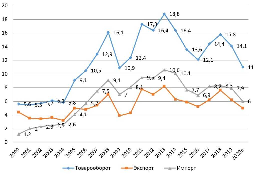 График 1. Динамика внешней торговли России со странами ЛКА, 2000-2020 гг., млрд долл.