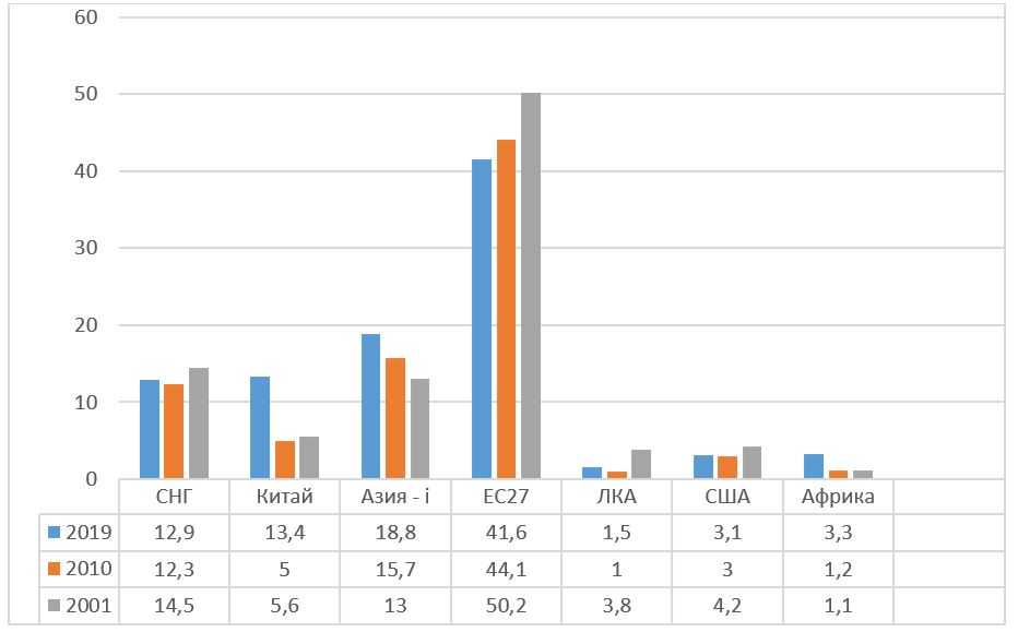 В сравнении с другими регионами и объединениями групп стран, ЛКА во внешней торговле России занимает последнее место, уступая даже Африке, доля которой в российском экспорте выросла с 1,1% в 2001 г. до 3,3% в 2019 г. (см. График 2.)