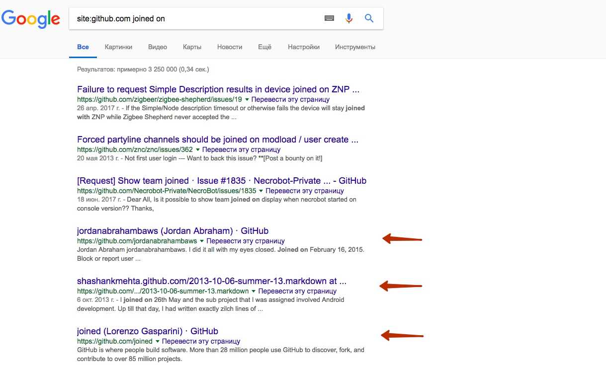 Или можно организовать поиск по GitHub, дописав «joined on», — получите профили