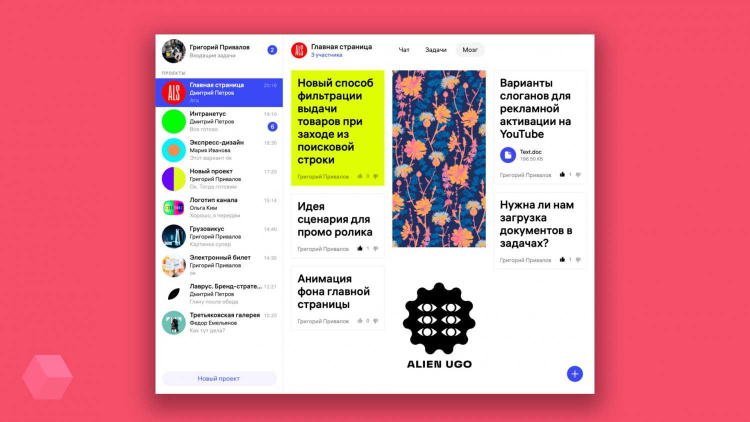 Необычный российский мессенджер аналог Ватсап от студии Артемия Лебедева. Представляет собой нетривиальное решение для корпоративных клиентов. Содержит в себе функционал для поддержания связи внутри команды в виде чатов, конференций и системой автоматизированного управления командой. Особенности: