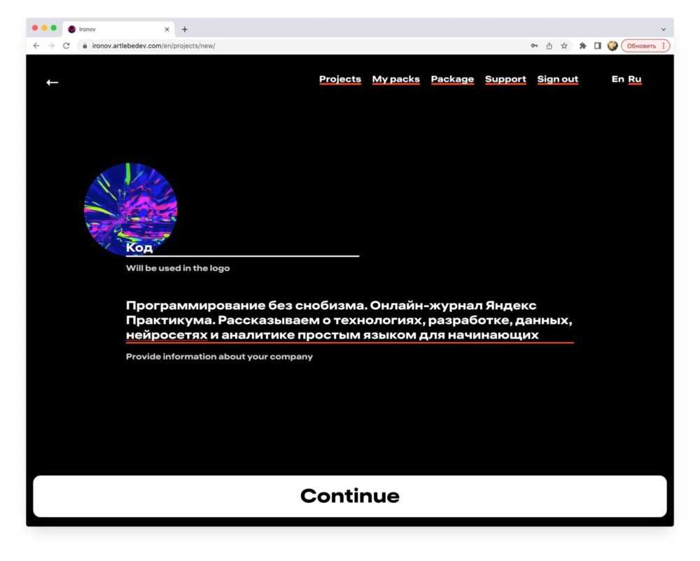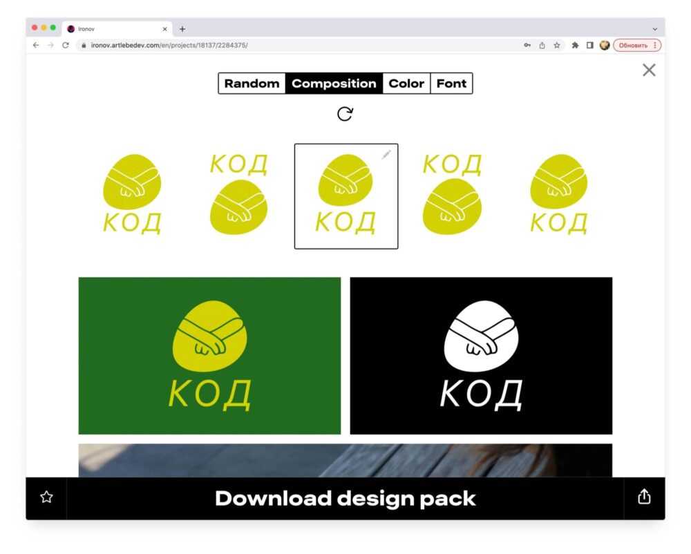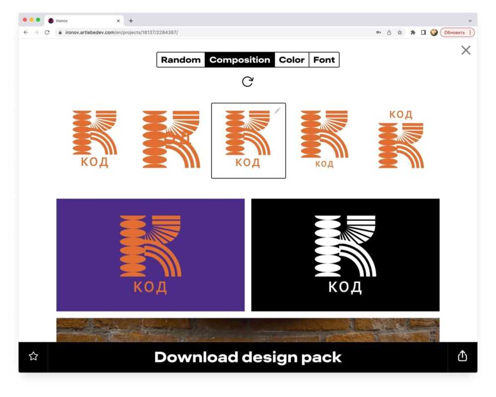 Иронов выплёвывает по три варианта логотипа за раз и сразу примеряет их в быту: на визитках, сумках, блокнотах и т. д. На каждый проект можно нагенерить до 999 вариантов.