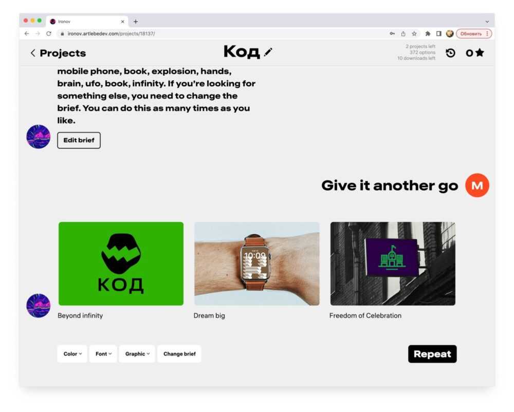 Иронов — идеальный вариант для клиентов, которые хотят «посмотреть ещё варианты». В этой нейронке просто залипаешь и генеришь, генеришь и генеришь. Когда варианты начнут лезть из ушей, придётся выбирать из того, что есть.