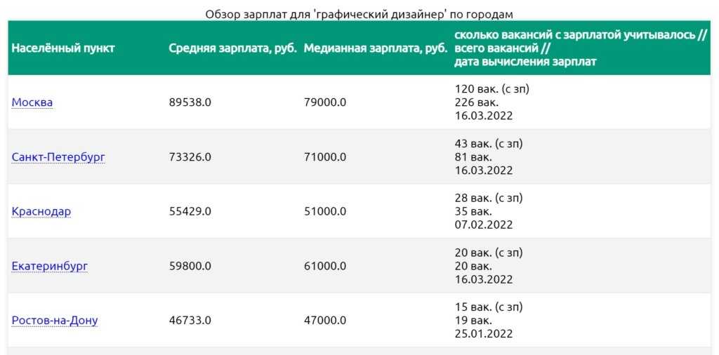 Обзор зарплат графического дизайнера по городам в феврале и марте 2022 года. Источник