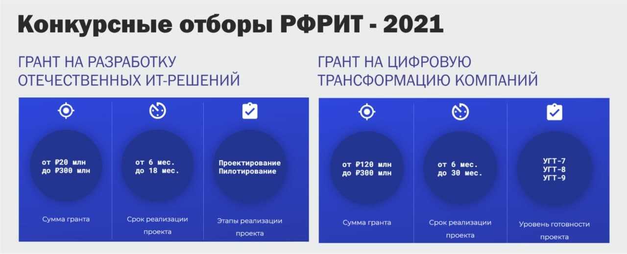 - грант на разработку отечественных ИТ-решений: конкурсный отбор проектов по разработке российских решений в сфере информационных технологий