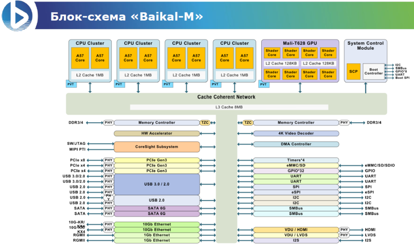 - Когерентная шина с L3 кэшем организована на решении ARM CoreLink. Она обеспечивает связь основных модулей микропроцессора и управление L3 кэшем для данных модулей.