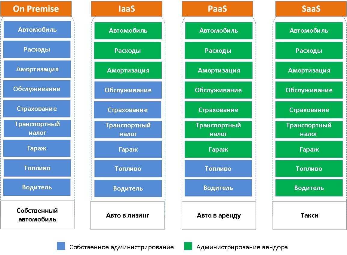 В последнем варианте (SaaS,Software-as-a-service),когда заказывается такси, клиент получает услугу под ключ. Вы садитесь в автомобиль, который доставляет вас до пункта следования, в салоне играет приятная музыка, вы платите только за саму услугу. Вопросы, касающиеся амортизации, налогов и страхования, заправки и сопутствующего сопровождения авто, вас не касаются. Между арендой автомобиля и моделью облачных сервисов много общего. Представленные ниже примеры тому подтверждение: