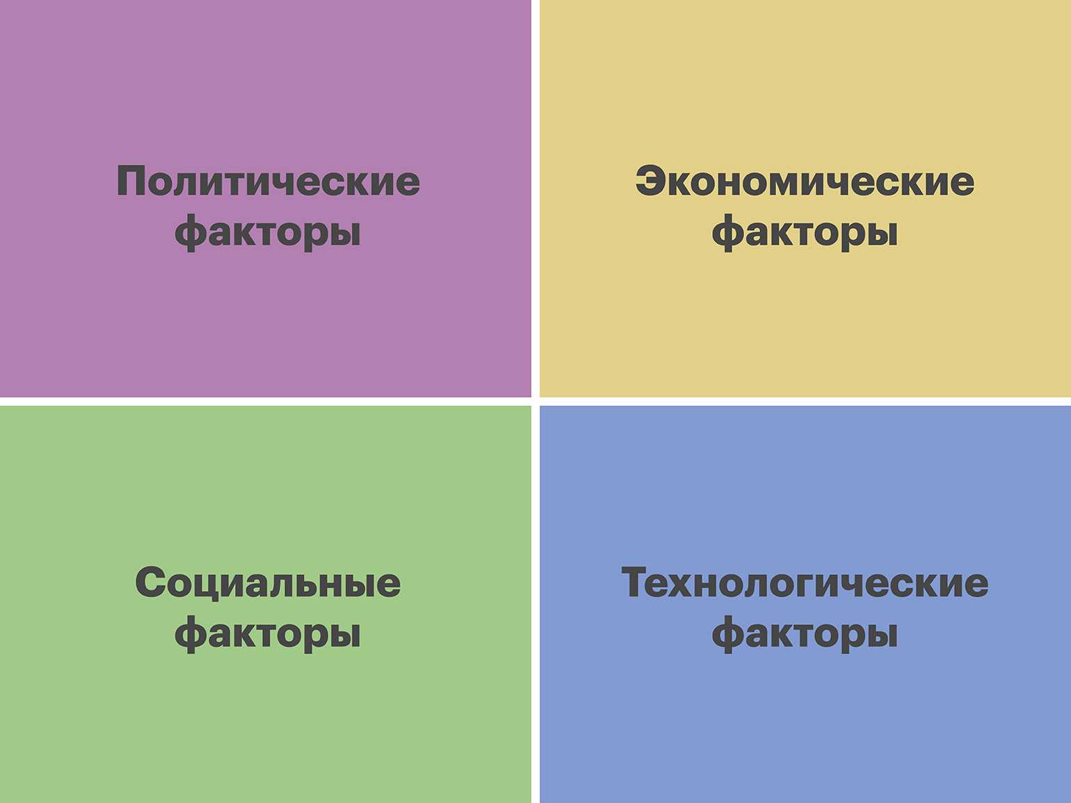 PEST-анализ — это модель для исследования внешнего окружения компании. Чтобы выполнить анализ, нужно описать четыре группы факторов, которые могут повлиять на предприятие.