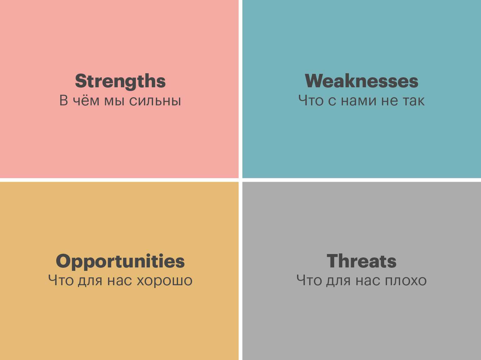 SWOT-анализ подразумевает поиск и внутренних, и внешних факторов. Strengths и Weaknesses — внутренние факторы: сильные и слабые стороны компании, на которые можно влиять. Например, скорость доставки заказов, ценовая политика, маркетинговая стратегия. Opportunities и Threats — возможности и угрозы: внешние факторы, которые оценивают в PEST-анализе.