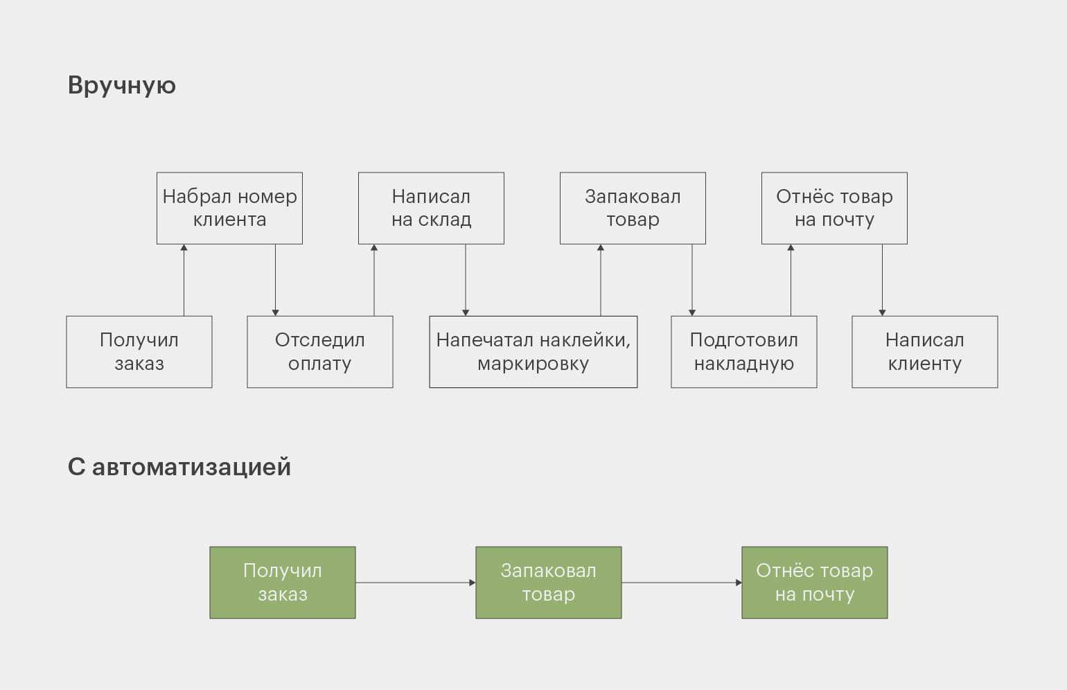 Автоматизация сведёт количество таких операций к минимуму. После получения заказа менеджеру останется только упаковать товар и отправить его клиенту.