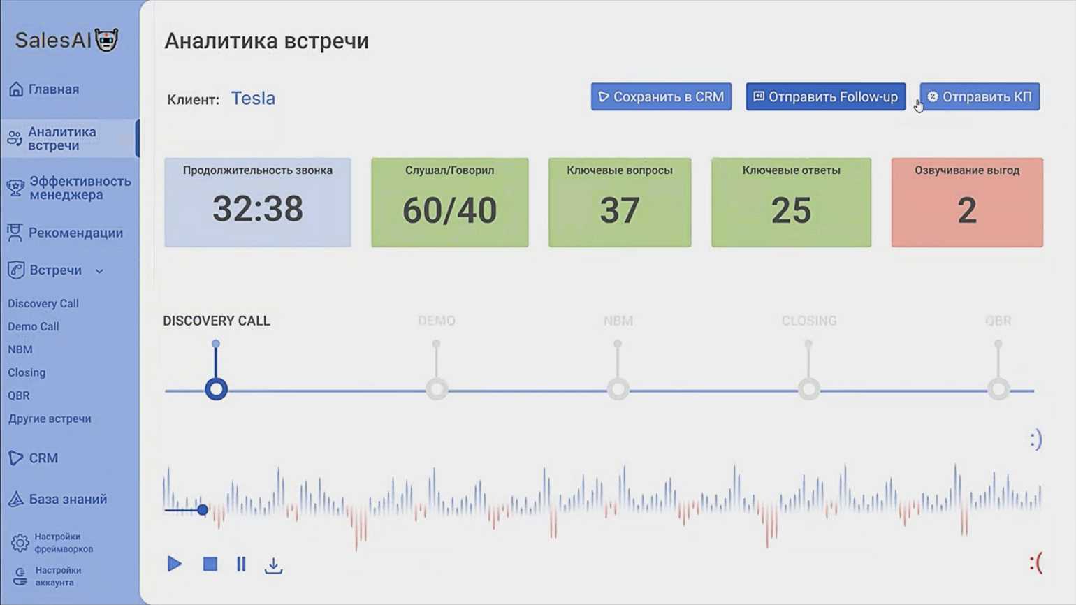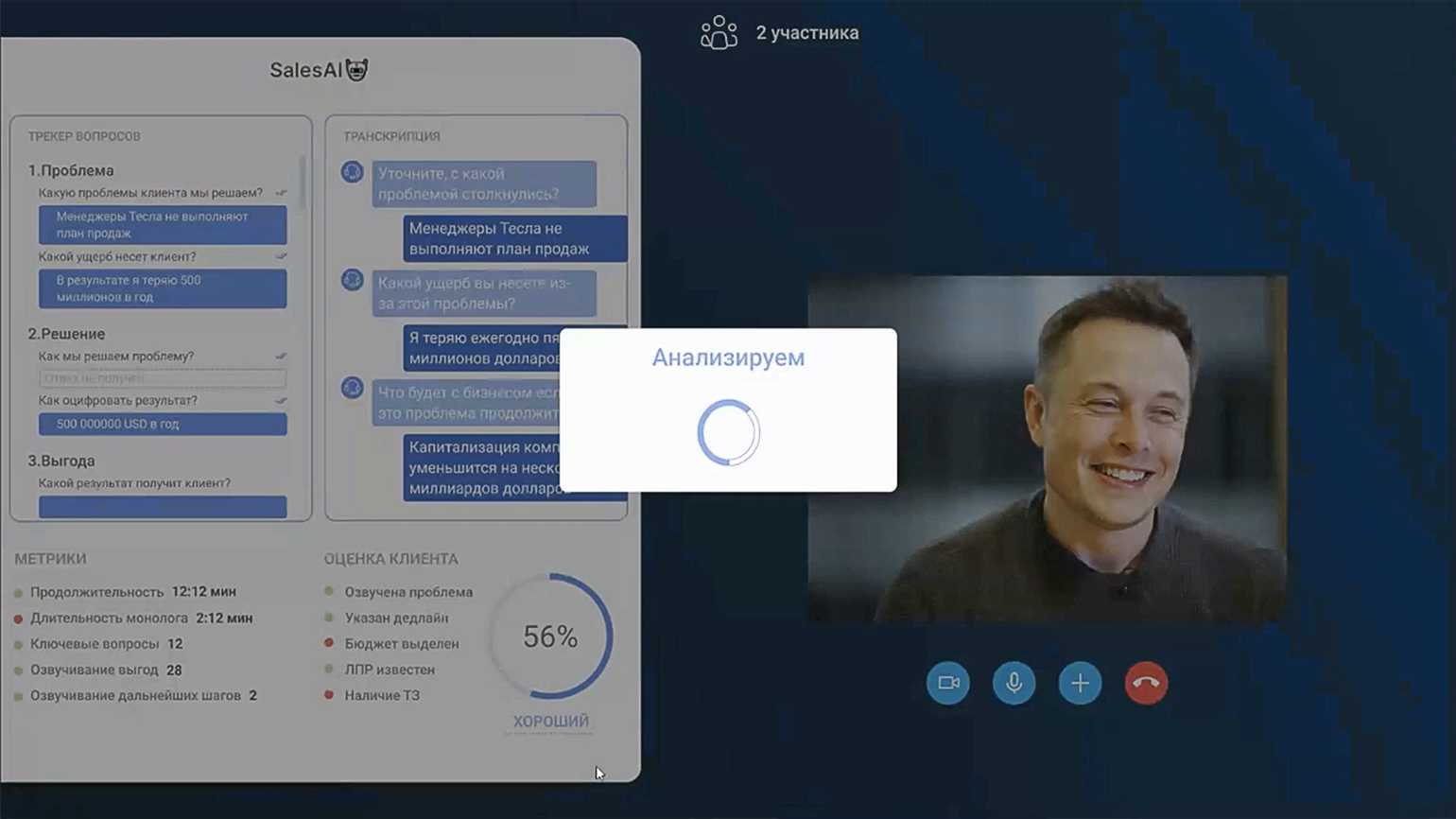 Так появилась система с искусственным интеллектом для управления фреймворком — SalesAI. Она интегрируется с CRM, а также с системой видеосвязи (Zoom, Google Meet, Skype) или IP-телефонии. Прямо во время звонка или встречи, пока менеджер говорит с клиентом, система расшифровывает речь и разбирается, к ответам на какие вопросы можно отнести фразы клиента. На основе анализа она в режиме реального времени даёт подсказки менеджеру.