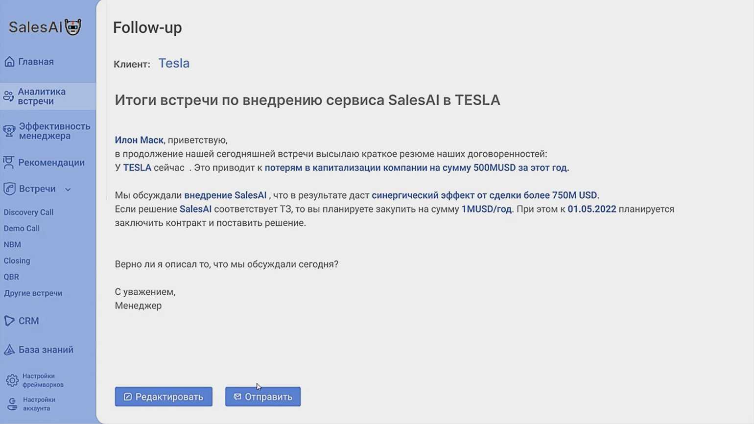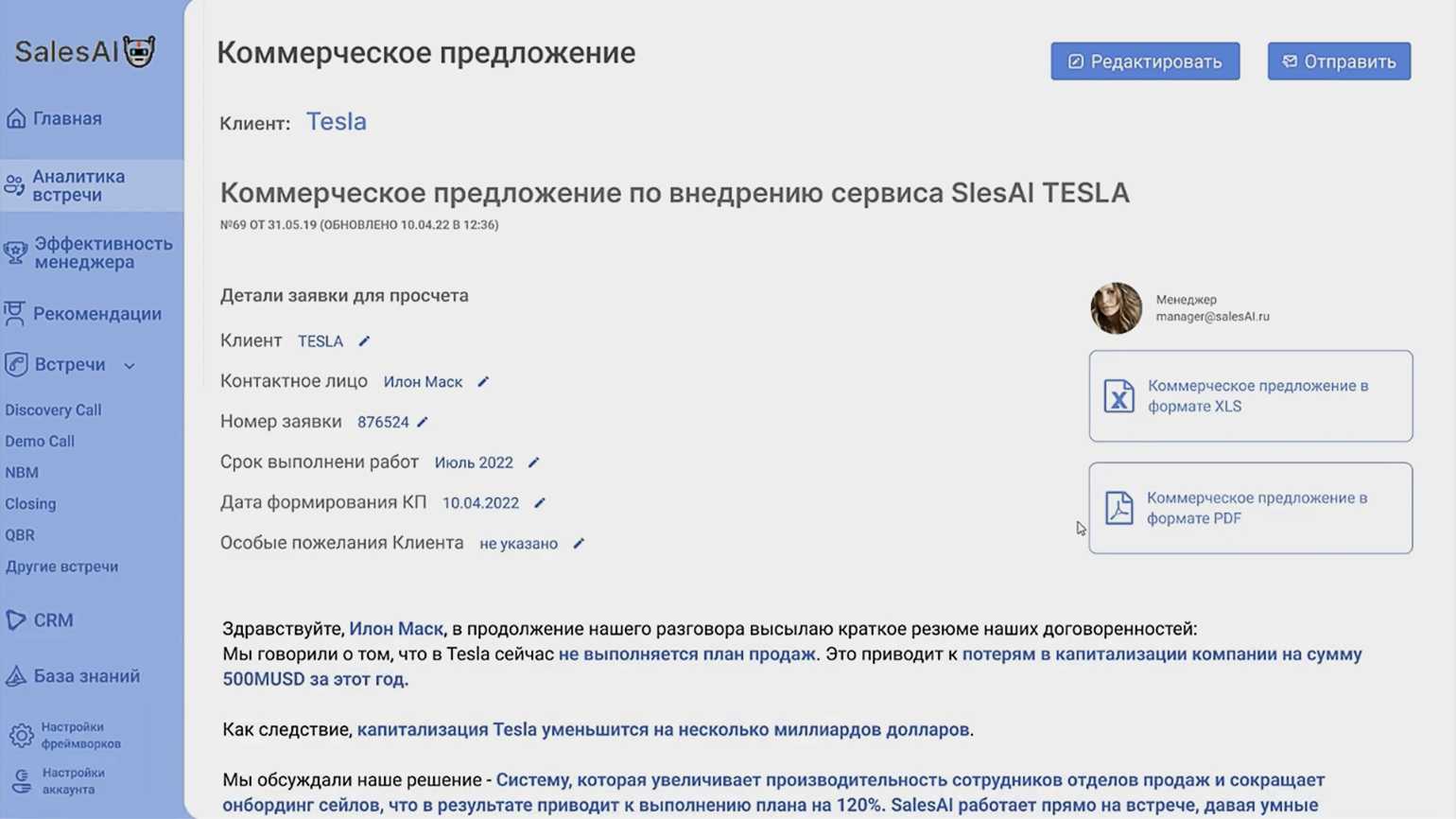 Также система автоматизирует рутину, на которой менеджер обычно теряет много времени, — составляет протоколы переговоров, фиксирует договорённости, оформляет коммерческие предложения. Всё это создаётся по заданным шаблонам автоматически после каждой встречи. Менеджеру остаётся только скорректировать готовые документы и отправить клиенту.