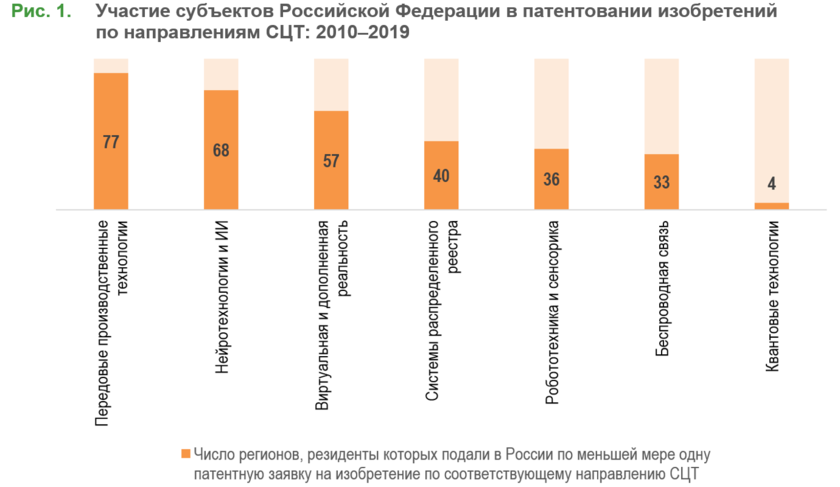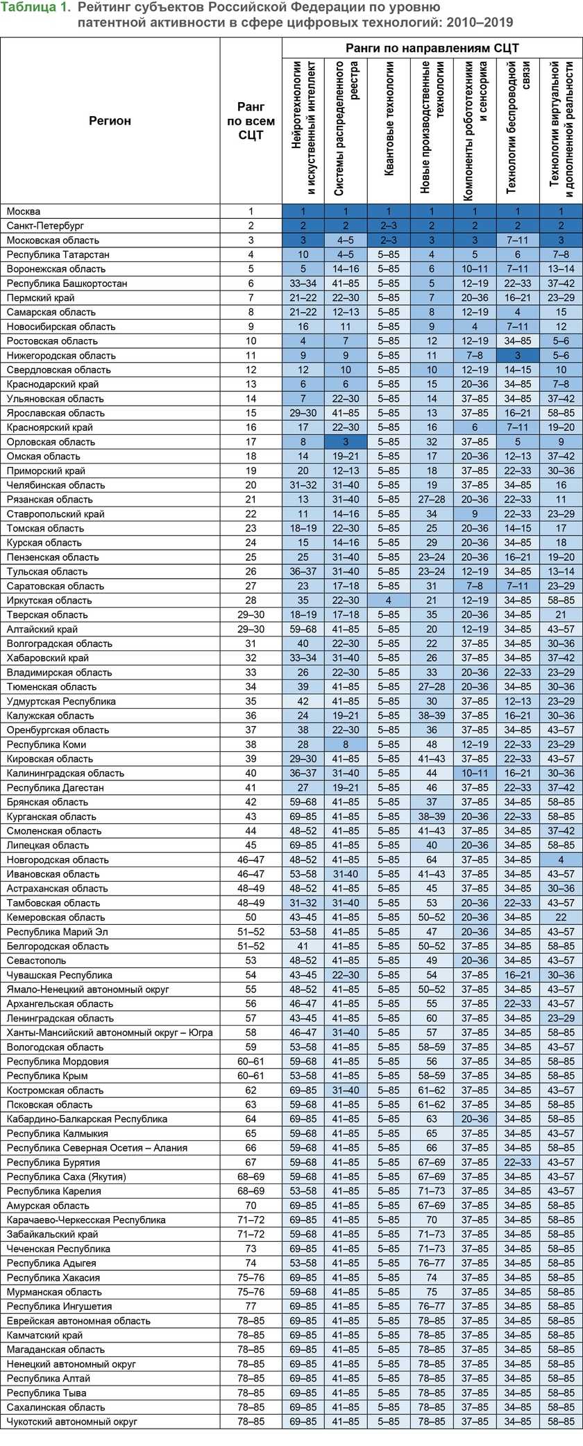 Место в рейтинге определялось по суммарному вкладу региона в общий поток поданных заявок на изобретения, связанные со всеми СЦТ. На долю столицы пришлось 40,6% отечественных патентных заявок на СЦТ (11,3 тыс. в 2010–2019 гг.). Наиболее сильные позиции Москва заняла в области разработки систем распределенного реестра (75,4% всех отечественных патентных заявок на изобретения, поданных в России по этой СЦТ за последнее десятилетие), виртуальной и дополненной реальности (54,9%), нейротехнологий и искусственного интеллекта (54,6%), беспроводной связи (53,6%).