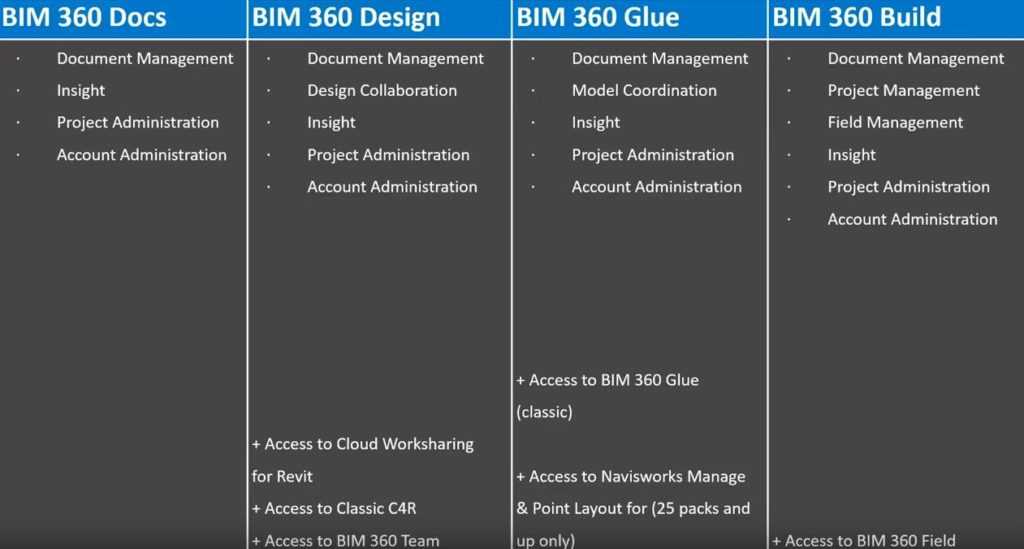 BIM 360 — облачный сервис хранения и обмена информацией, включает 4 разновидности (набора) — Docs, Design, Glue, Build. Представляет собой единую информационную среду (все наборы сервиса связаны между собой).
