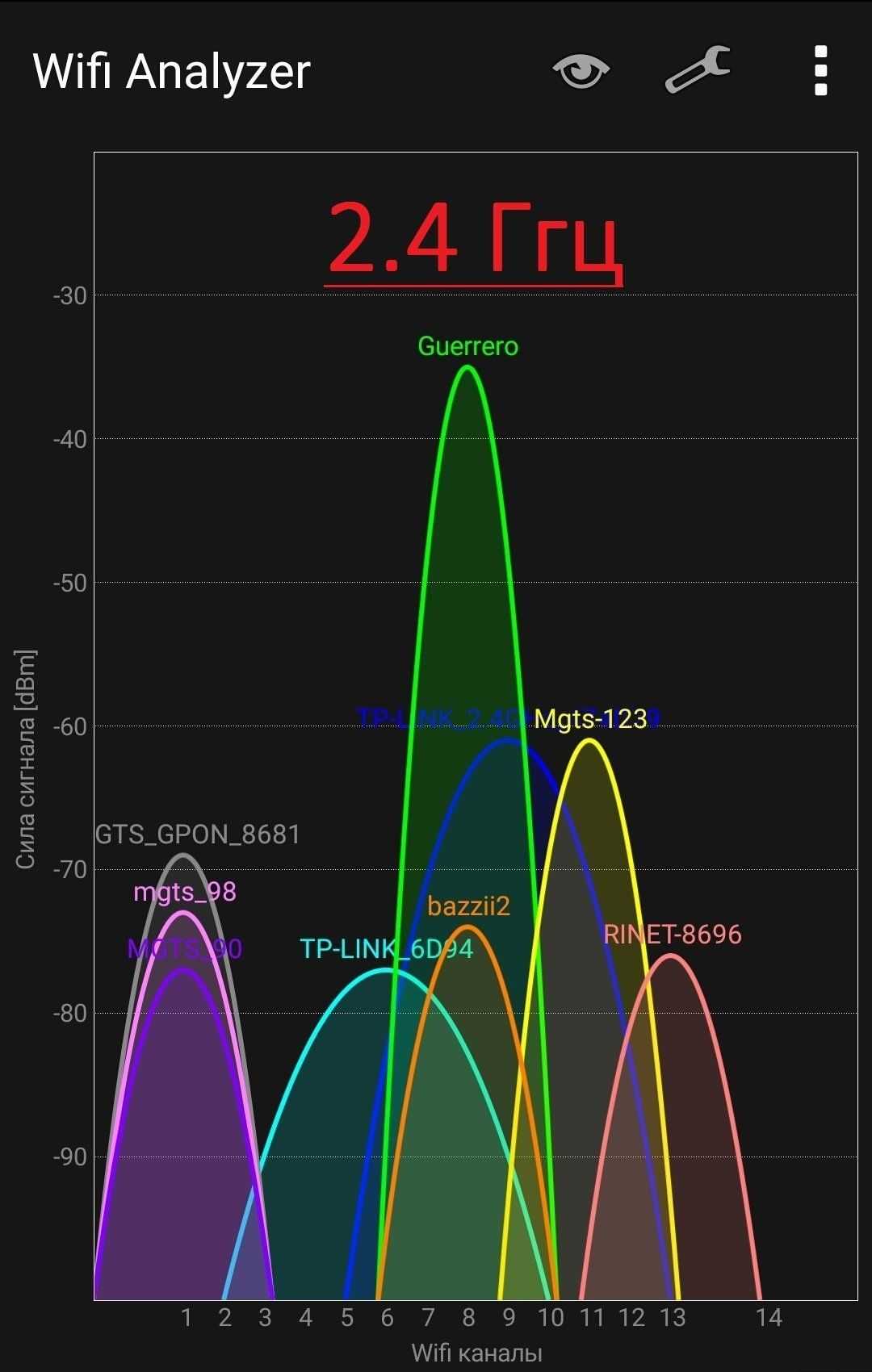 Нужно отметить отдельно возможность работы роутера на частоте 5 гигагерц. Старый тип на частоте 2,4 гигагерц, как и многие бытовые приборы, например микроволновая печь. При одновременной работе в одном частотном диапазоне скорость передачи данных может снижаться. Вот как выглядит радиоэфир в этих двух частотах – видно, что на старой частоте соседи мешают друг другу работать: