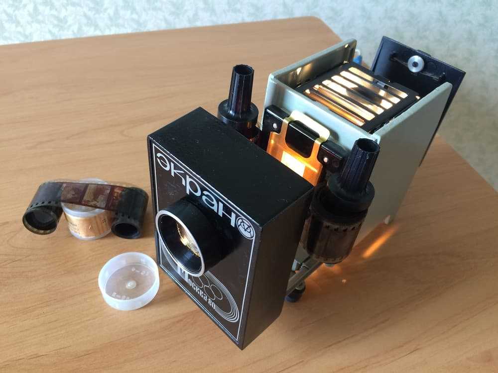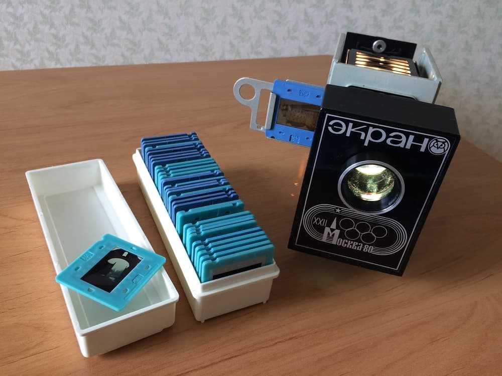 В диапроекторе стояла мощная лампа, с помощью которой изображение с маленького слайда воспроизводилось на большом экране. У кого экрана не было, те вешали на стену обычную белую простыню. Такие слайды смотрели часто большой компанией или всей семьей, к тому же в затемненной комнате.