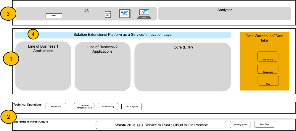 Наконец, 4-й блок учитывает все аспекты инноваций и интеграции. Таким образом данная схема станет хорошей отправной точкой при проектировании архитектуры. Подобная схема облегчает понимание сложностей, связанных с реализацией крупного проекта по переходу на SAP S/4HANA, и помогает сосредоточиться на его ключевых аспектах.
