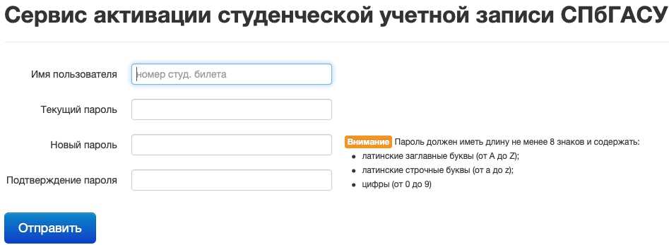 Для использования портала необходимо активировать учётную запись – сменить временный пароль. Студенту потребуется заполнить предложенную форму, указать имя пользователя, ввести старый пароль, после чего сгенерировать и подтвердить новый.