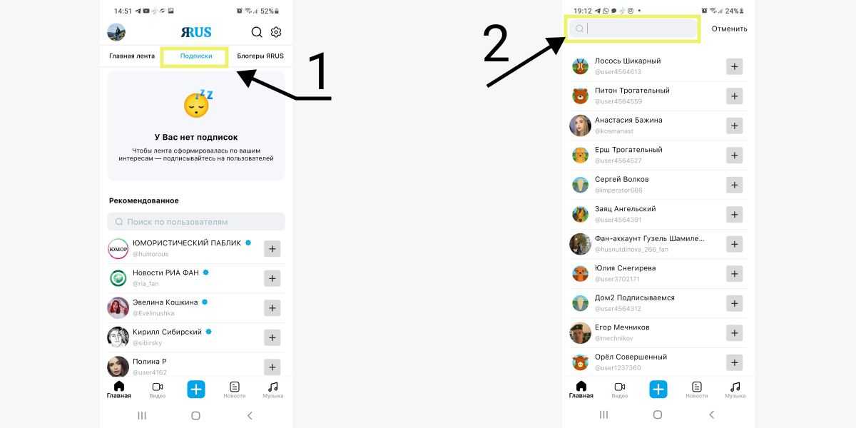 От главной ленты новостей смахните влево, чтобы перейти во вкладку «Подписки». В поисковой строке вы можете найти кого-то определенного или выбрать что-то из рекомендованного и популярного, пролистав ленту вниз.