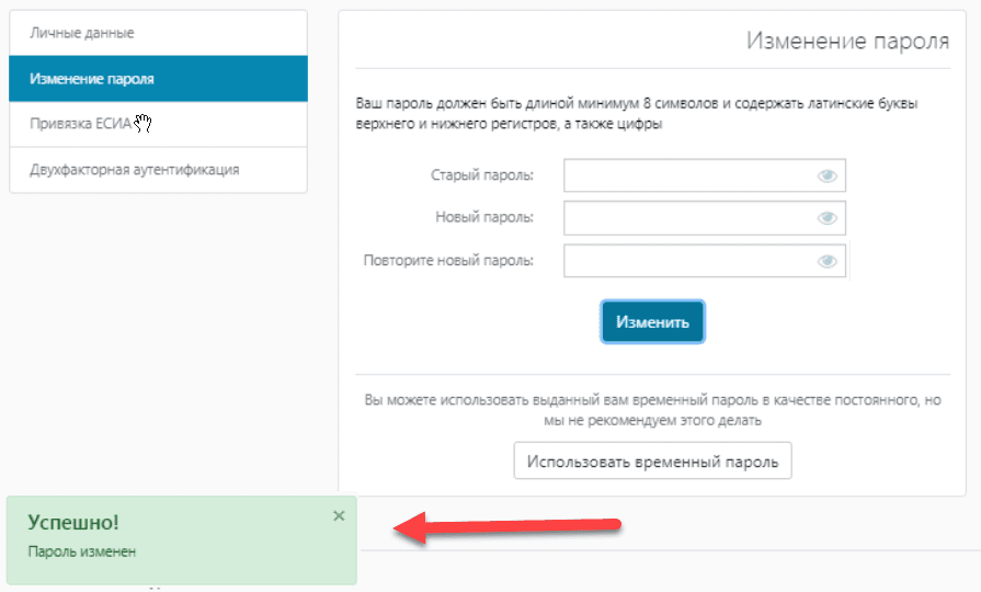 - Если процедура прошла успешно, в левом нижнем углу появится надпись: «Успешно! Пароль изменен».