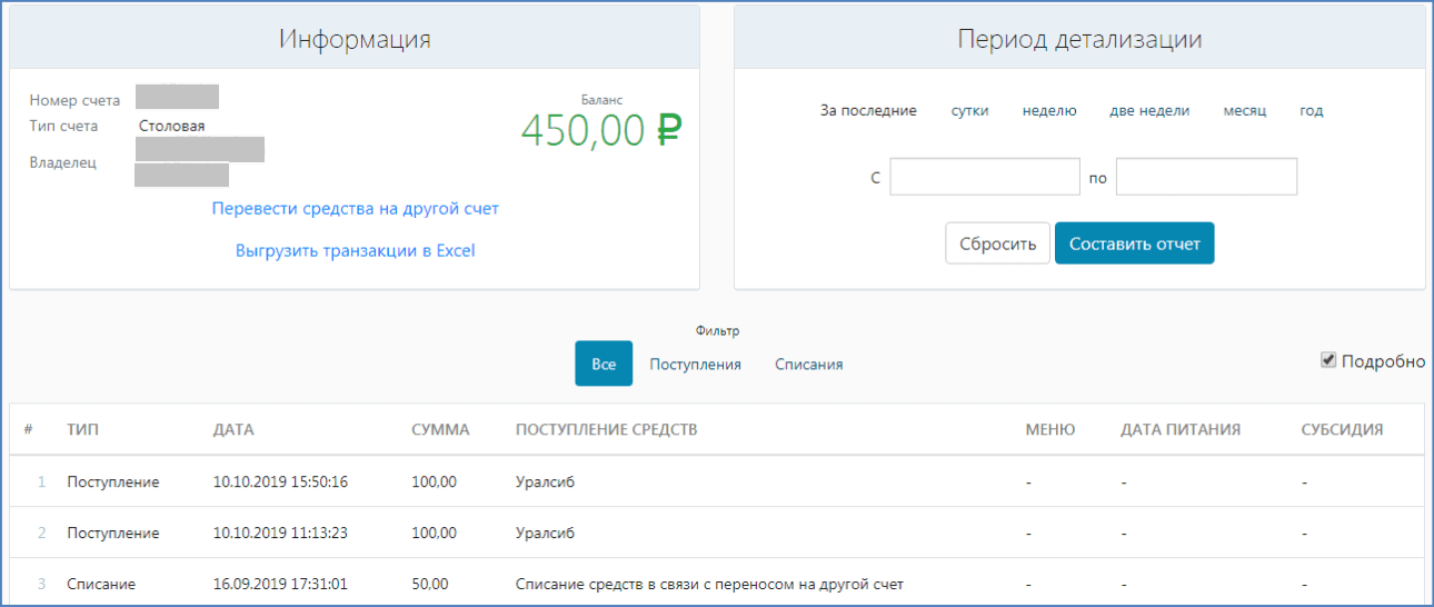 Карта позволяет оплачивать питание в столовой и буфете, а также проезд по установленным перевозчиком тарифам. К ней привязаны два лицевых счета: