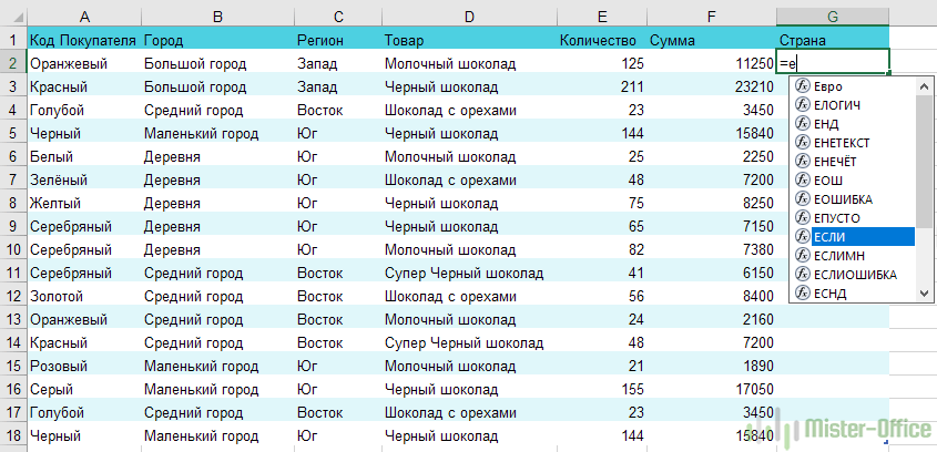 Устанавливаем курсор в ячейку G2 и вводим знак “=”. Для Excel это означает, что сейчас будет введена формула. Поэтому как только далее будет нажата буква “е”, мы получим предложение выбрать функцию, начинающуюся этой буквы. Выбираем “ЕСЛИ”.