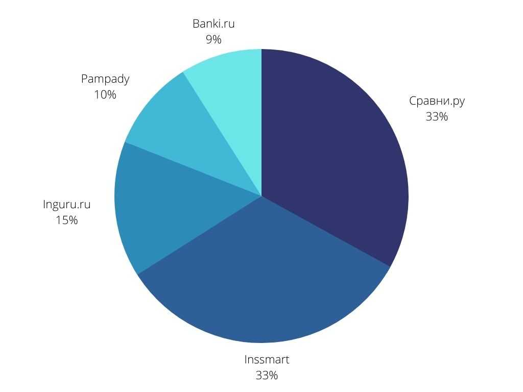 В выборе лучшей платформы для оформления полиса также может помочь опыт других брокеров. Мы проанализировали частоту использования самых популярных площадок и выявили пятерку лидеров по процентному соотношению числа пользователей: