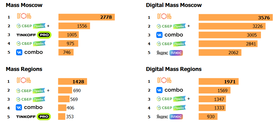 - Лидером рейтинга выгоды по всем анализируемым профилям является подписка Огонь провайдера «Сеть Партнёрств». Лидирующие позиции подписке обеспечило богатое наполнение сервисами, предлагающими потребителю выгодные условия по широкому перечню как финансовых, так и lifestyle-категорий;