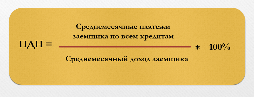 Показатель долговой нагрузки (ПДН) – это соотношение суммы ежемесячных платежей по кредитам (уже оформленным и оформляемым сейчас) к актуальному доходу семьи. Также иногда встречается обозначение этого показателя в виде аббревиатуры PTI (payment-to-income). Таким образом банк определяет, сколько свободных денег остается в распоряжении потенциального заемщика после уплаты по кредитам и хватит ли их для текущих нужд. В противном случае есть риск, что заемщик не справится с обязательствами.