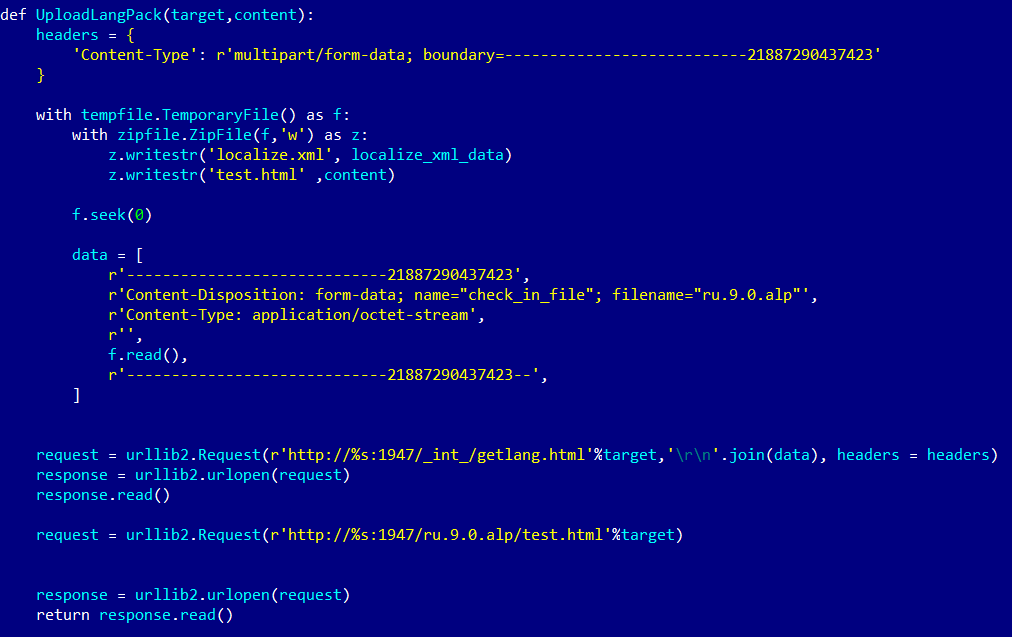 Первым делом мы обратили внимание на функцию локализации — пользователь мог загрузить языковую локализацию в виде двух файлов, один из которых localize.xml. Во втором html файле присутствуют параметры, один из которых оказался уязвим к переполнению буфера