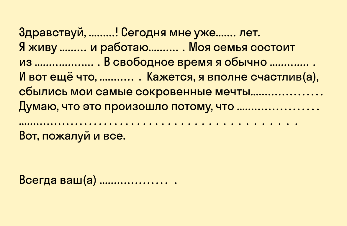 Цель такого послания — в нужный момент вспомнить о своих сильных сторонах и о важных целях, которые вы смогли пронести через годы. Кто же еще, как не вы сами, сможет найти нужные слова;