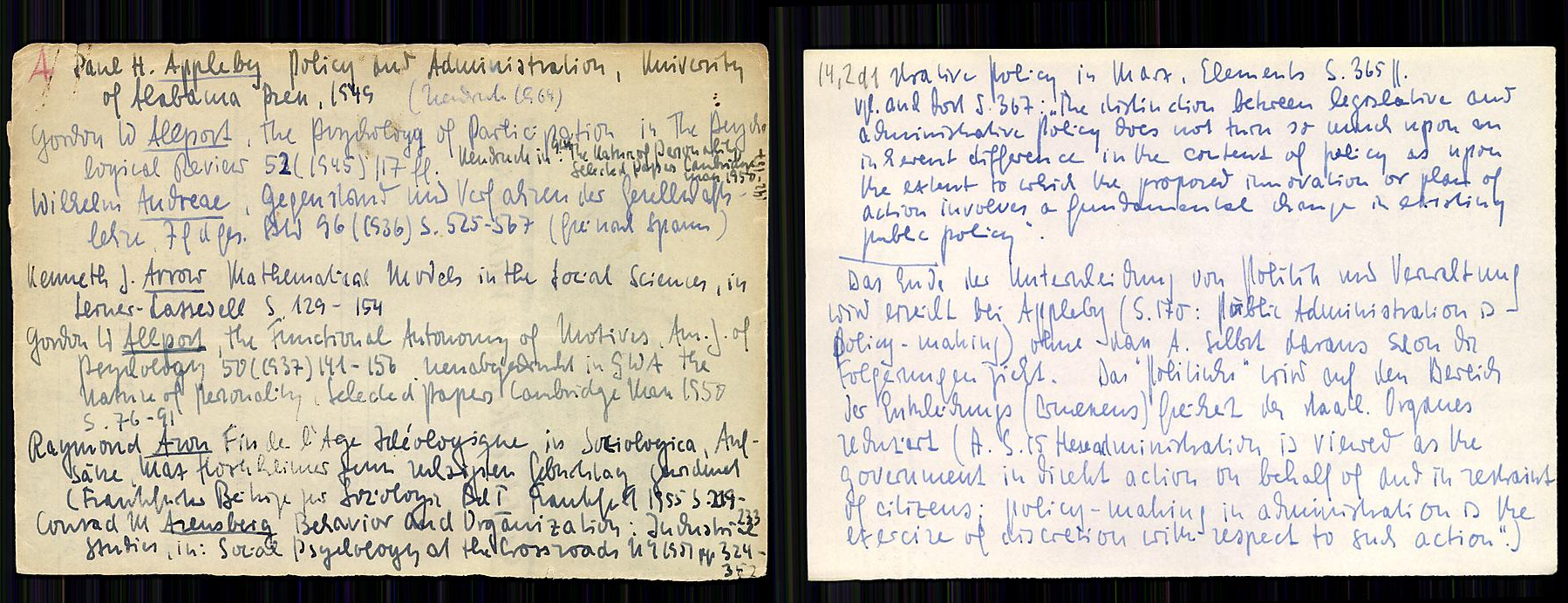 Слева — библиография Лумана, а справа — карточка 14,2d1, которая ссылается на первую книгу в списке, «Политика и администрация» Пола Эплбая