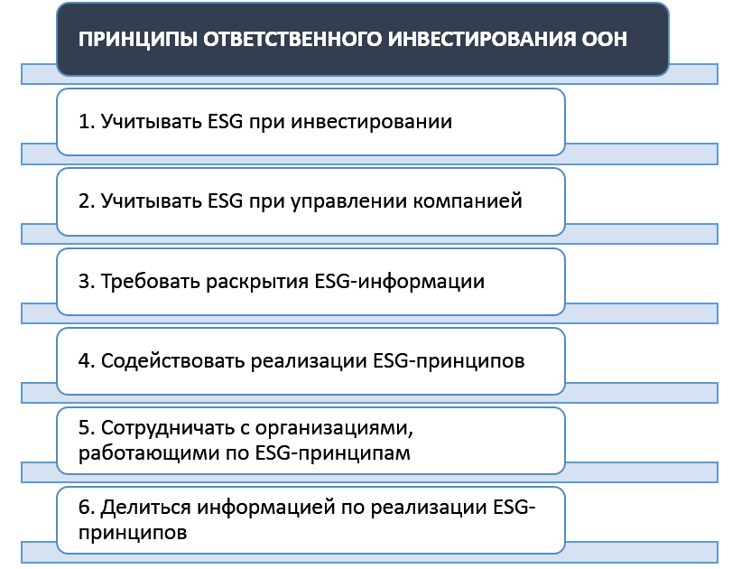 ESG и «ответственное инвестирование» часто используют как синонимы. Эти термины действительно близки, однако не являются полными аналогами. Принципы ответственного инвестирования (Principals for Responsible Investment или PRI) – это 6 положений, сформулированных ООН при поддержке 20 крупных институциональных инвесторов в 2006 году. Каждая компания, подписавшая декларацию о PRI, берет на себя обязанность: