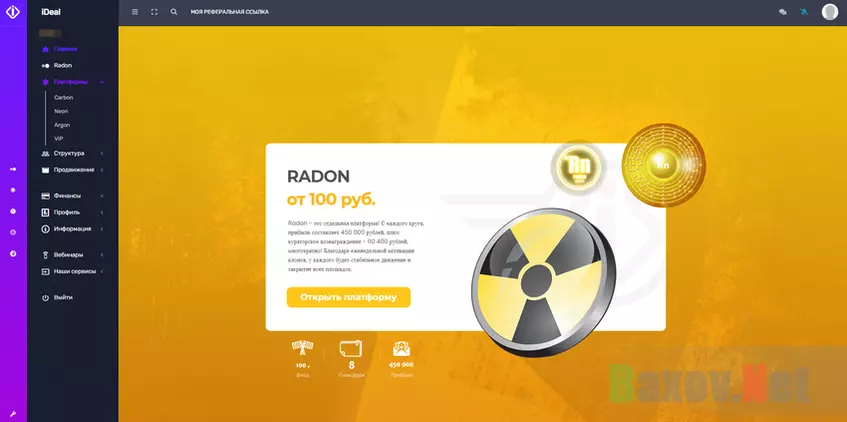 В RADON 8 площадок, движение по которых якобы автоматическое. Как только закрывается одна площадка людьми (или клонами), вы автоматически передвигаетесь на более дорогую. Якобы платить ничего не нужно. На самом деле нужно. Вы помните про еженедельную абонентскую плату? Впрочем, минимизировать расходы жулики предлагают старым способом – пиарить этот лохотрон и заманивать на него других людей. Они вместо вас будут покупать места в платформах, а администрация будет отчислять часть своих денег вам.
