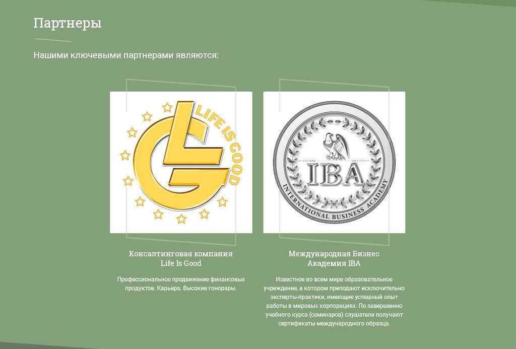 Зато сайт с более чем простенькой архитектурой исправно рекламирует партнеров — Лайф из гуд и Международную Бизнес Академию IBA.