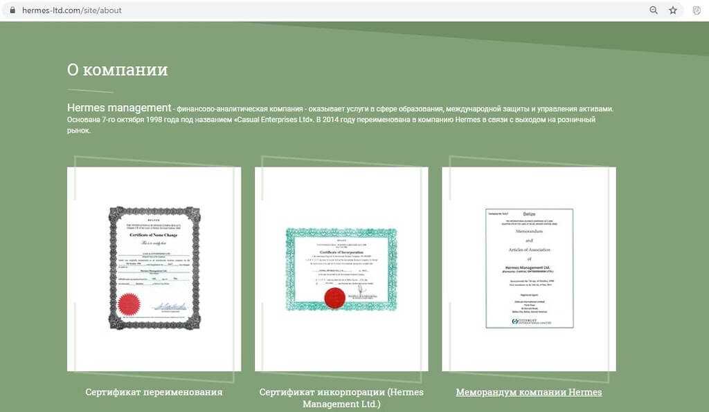 Еще один партнер Life is good — компания Hermes Ltd Com (https://hermes-ltd.com) зарегистрирована также в Белизе в 1998 году, что совпадает странным образом с началом активной финансовой карьеры Романа Василенко. В 2014 фирма пережила ребрендинг и получила громкое название.