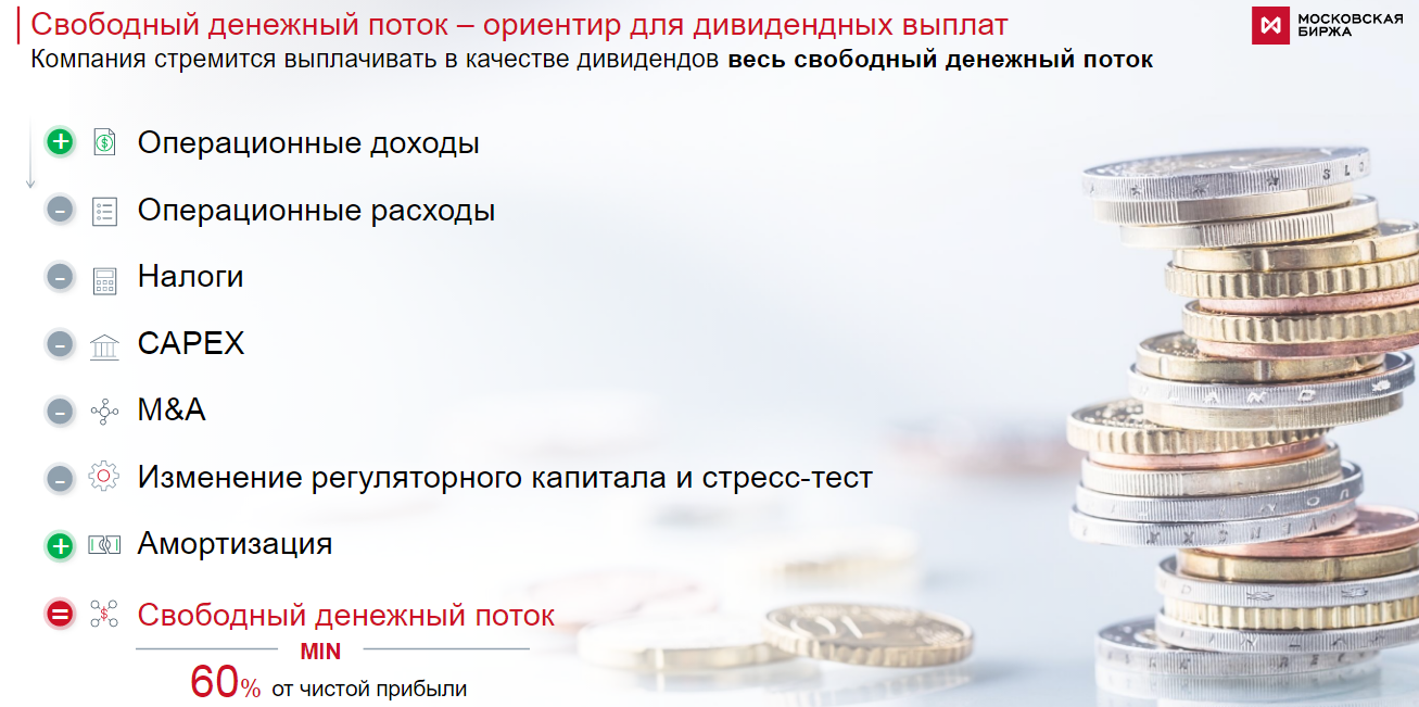 Мосбиржа анонсировала новую дивидендную политику, где установлен минимальный порог в 60% от прибыли по МСФО, а основа выплат будет формировать из свободного денежного потока. Так же компания стремится к тому, чтобы комиссионные доходы составляли около 70% всех доходов. Это очень важный момент, т.к. финансовые доходы плавают в зависимости от ключевой ставки, а комиссионные доходы более постоянные.