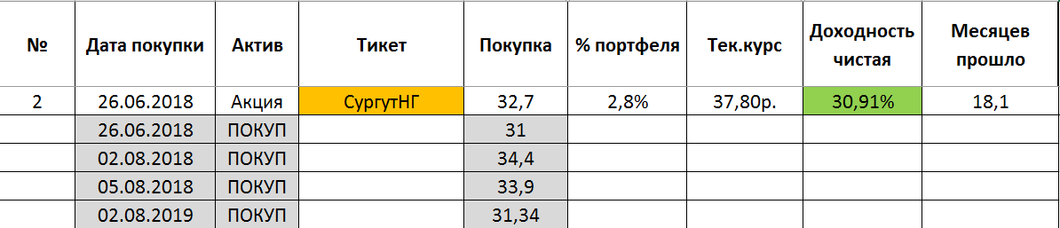 Сургут-НГ(пр) — удалось спекулятивно продать по 43 рубля и потом откупить по 31,3 рубля после див. ГЭПа. Основная позиция в портфеле занимает около 3% и продавать пока не планирую. С учетом того, что курс доллара на конец 2019 года будет ниже, чем на конец 2018, у СНГ будет скорее всего бумажный убыток и низкие дивиденды, надеюсь, это даст возможность еще немного подкупить акций ниже 33 рублей (моя средняя).