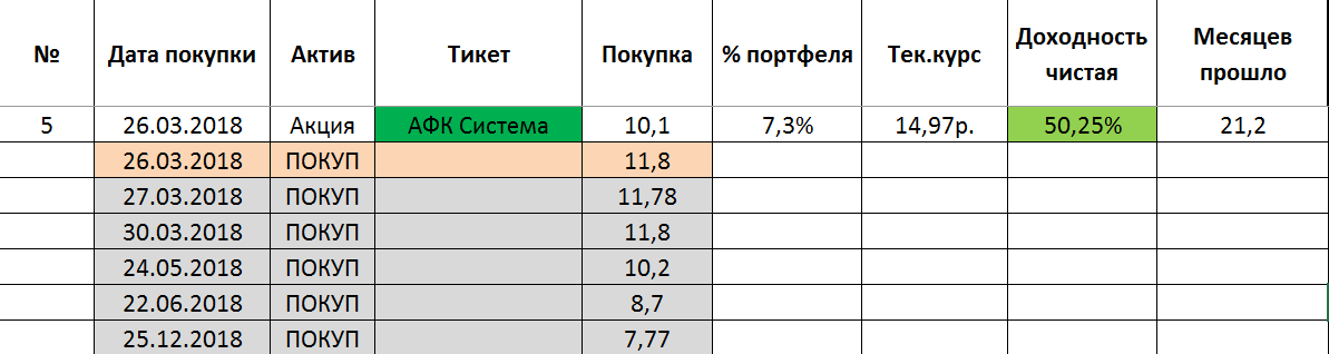 АФК Система — была достаточно большая доля акций данной компании в портфеле, пересидел в ней все походы в сторону 7 рублей, по возможности докупал. На данный момент сократил позицию до 7,3% от портфеля и продолжаю удерживать с целью 20+ рублей.