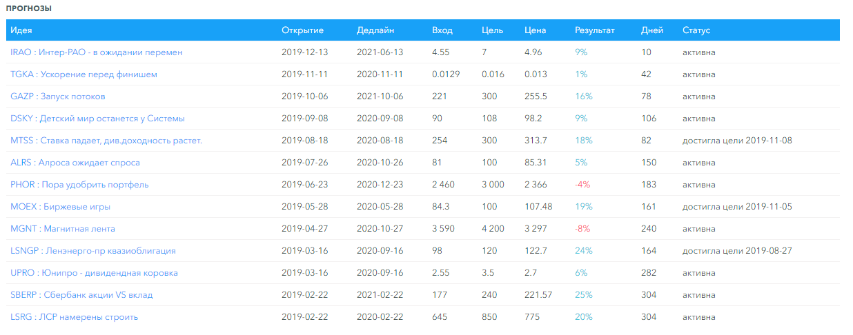 Пользуясь случаем, приведу скрин с моими прогнозами за 2019 год, там описаны цели, примерный срок и эмитенты. Данные прогнозы доступны на сайте. Я время от времени буду делать посты о том, что считаю интересным и почему. Почти все идеи, которые я описываю, сам же и покупаю. Некоторые компании не успел купить в силу отсутствия свободных средств на счете.