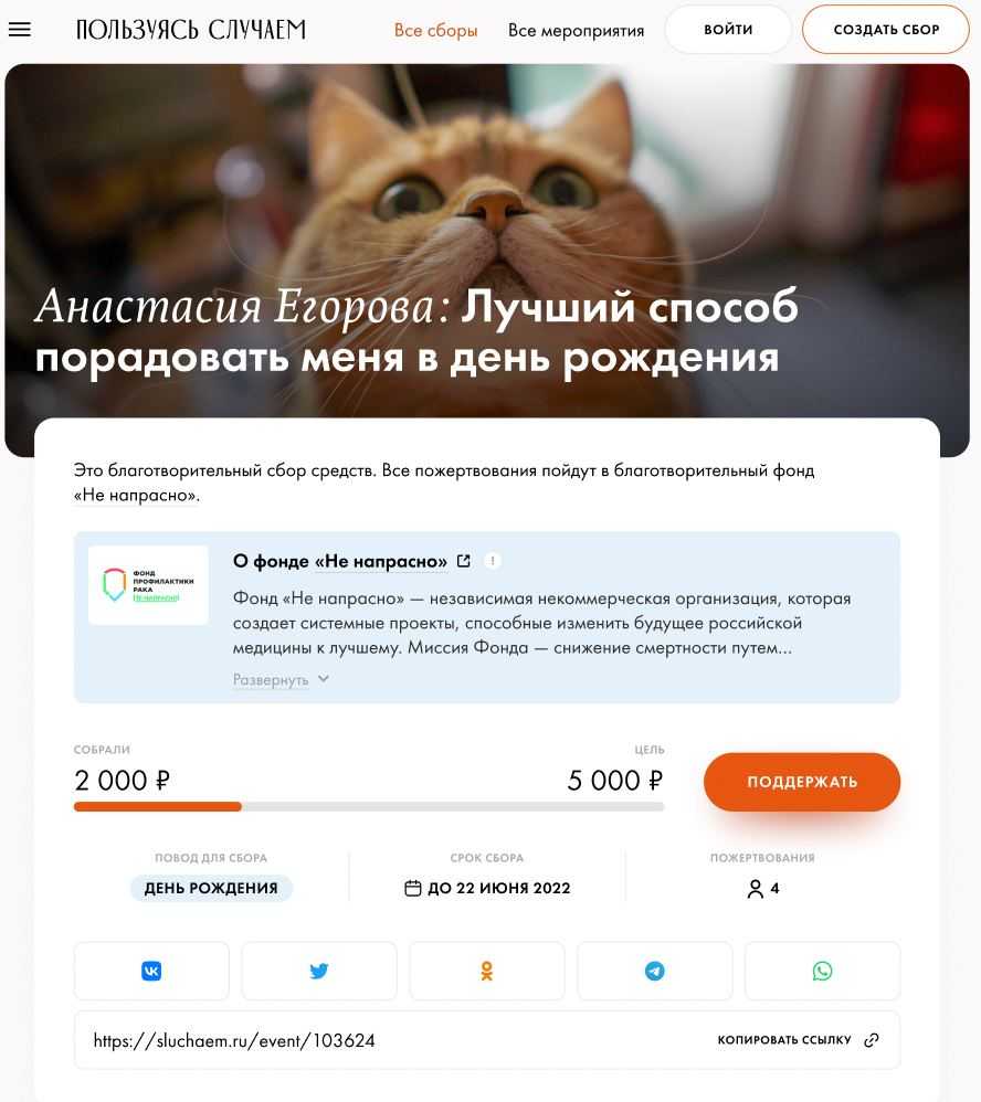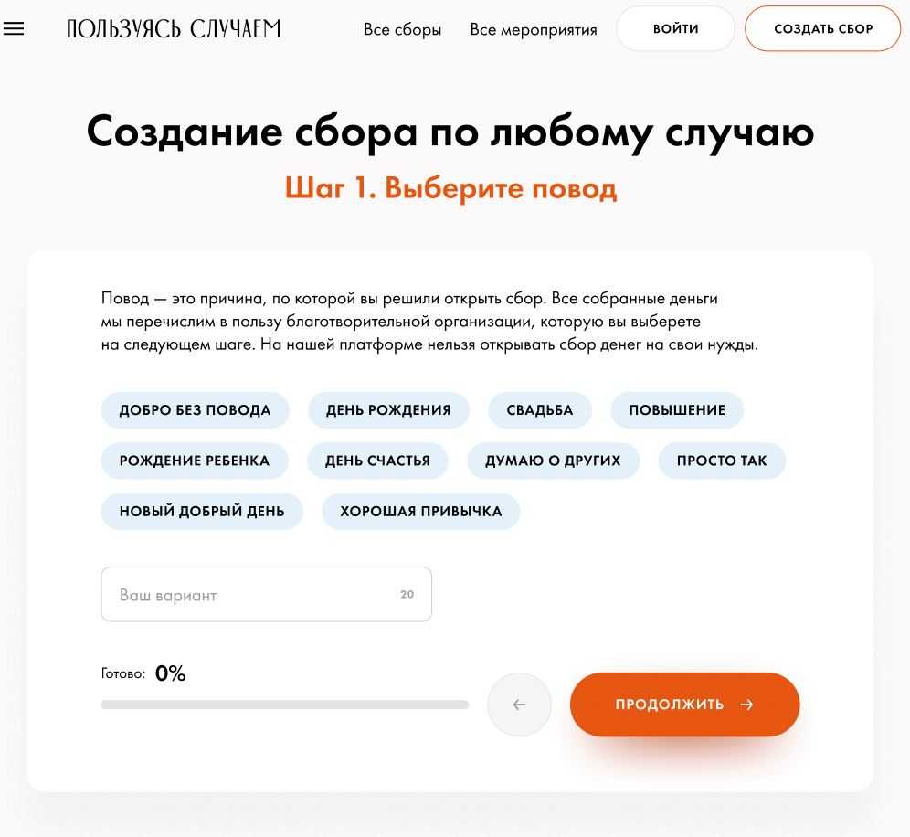 Чтобы создать сбор, вам нужно заполнить анкету на сайте «Пользуясь случаем», для этого: