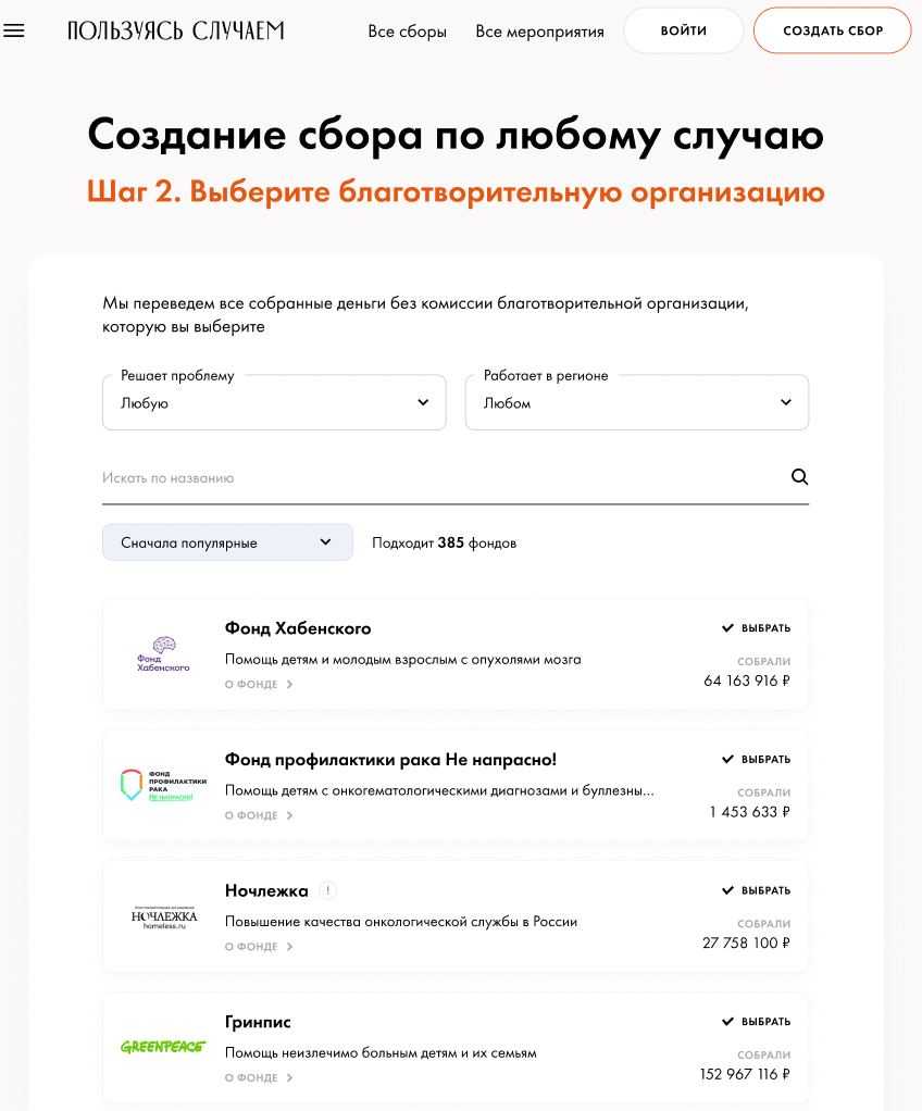 - Вы можете выбрать конкретный фонд, ценности и цели которого вам близки. Список всех верифицированных фондов можно посмотреть на сайте «Нужна помощь», либо на втором шаге создания сбора на «Пользуясь случаем».
