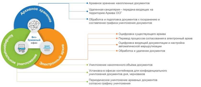 - Архивное хранение документов. Уже накопленные в компании документы принимаются на хранение в архивные хранилища ОСГ, которые представлены по всей России. А для вновь поступающих документов предусмотрен сервис удаленной канцелярии: входящие документы будут поступать не в офис компании, а напрямую в архивы ОСГ и предоставляться клиенту в оцифрованном виде.