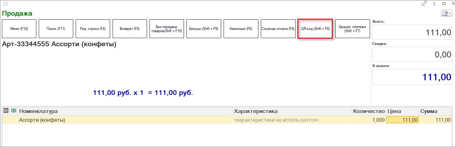 После подключения платежных систем можно выбрать новый способ оплаты — QR-код (Shift+F8) в верхней панели кнопок РМК.