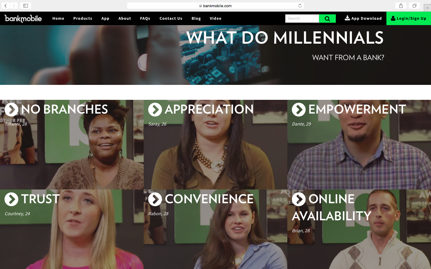 Во время официального запуска BankMobile на NYSE, Adrenaline представила видео, которое представляет собой захватывающий процесс описания взглядов и отношений Миллениалов к сегодняшним сервисам, а также выявления их ожиданий и предпочтений, вокруг которых уже и строилась вся платформа BankMobile. Основным выводом из проведенного интервью стало то, что банки делают недостаточную ставку на Поколение-Y и из-за этого не предлагают им тот формат услуг, который они ожидают.