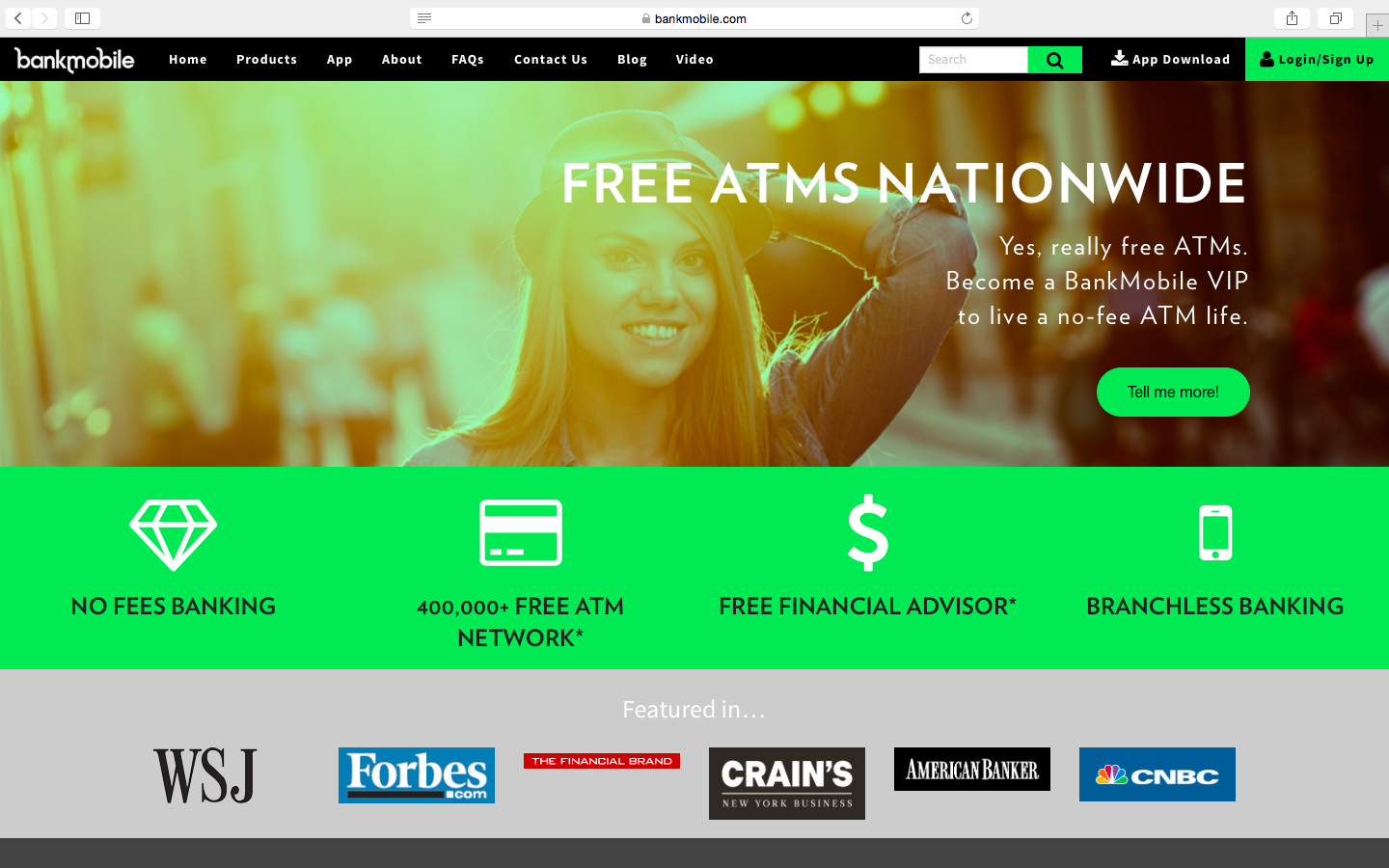 BankMobile как цельная платформа без отдельных представительств, работает абсолютно без комиссий и ориентирована исключительно на Миллениалов, которые ищут мобильность и гибкость в вопросах предоставления банковских услуг. Сервис предоставляет бесплатное ведение текущих и сберегательных счетов, а также персональную кредитную линию до $5000.У клиентов есть возможность использовать порядка 55000 банкоматов в США без комиссионных сборов.