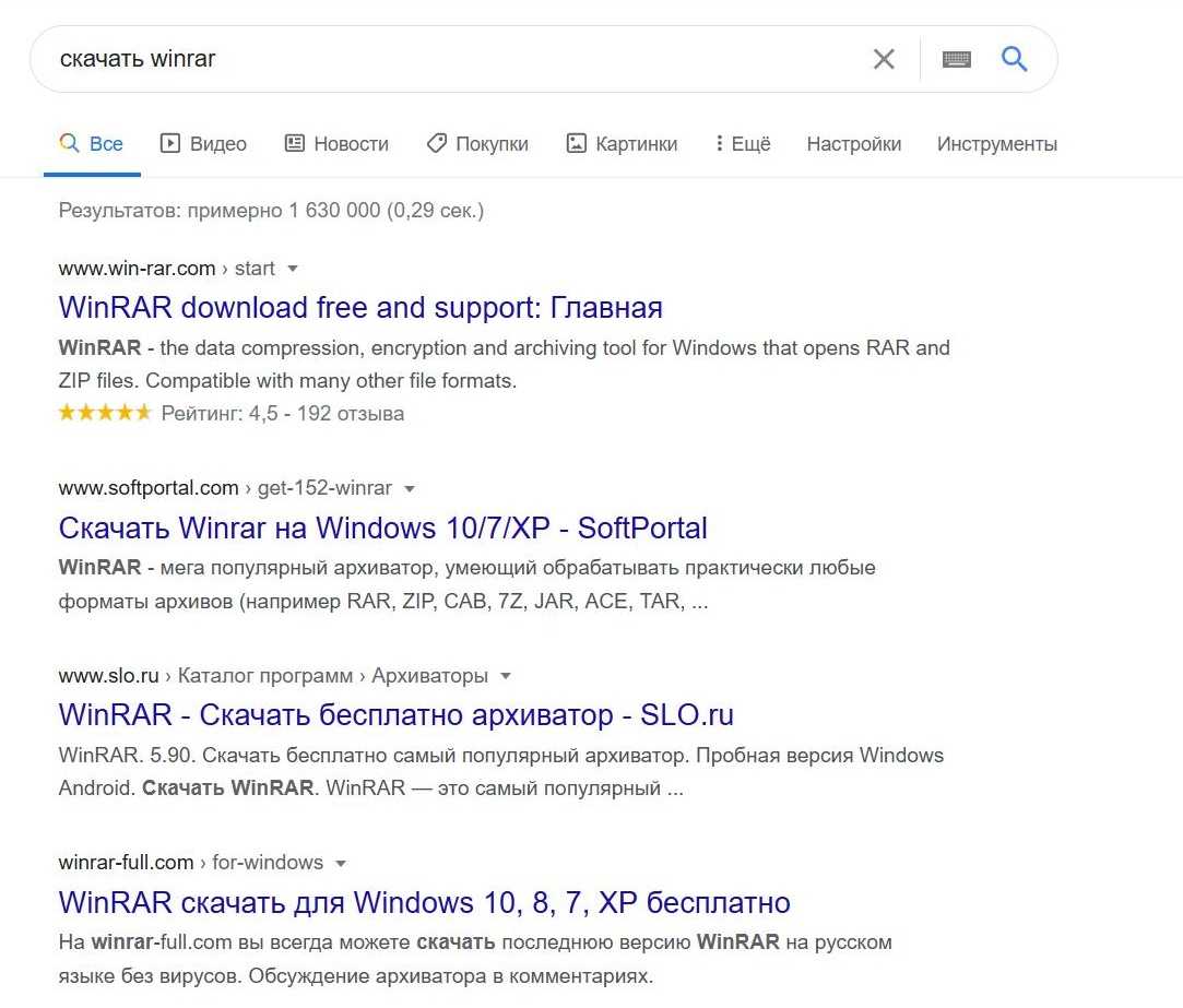 Попробуйте, например, ввести в поиске «скачать winrar». Ни на первой, ни на второй странице с результатами поиска не будет официального сайта разработчиков WinRAR – rarlab.com.