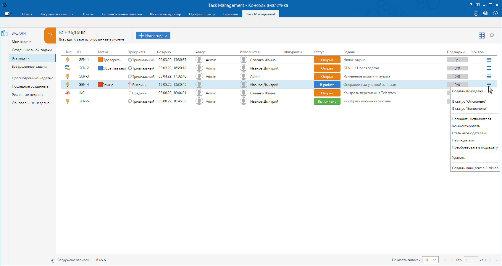 «Досье» на сотрудников собраны в «Карточках пользователей» — это удобный агрегатор всей информации на сотрудника — от ФИО, должности и контактов до сводок по активности, авторизациям, психологических характеристик и перечня всех инцидентов, в которых он был замечен. Управлять инцидентами помогает Task Management — инструмент, в котором можно заводить задачи, распределять их, уточнять статус расследования и т.д.