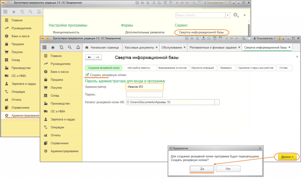 Инструмент «Свертка информационной базы» находится в меню «Администрирование» -> «Сервис»
