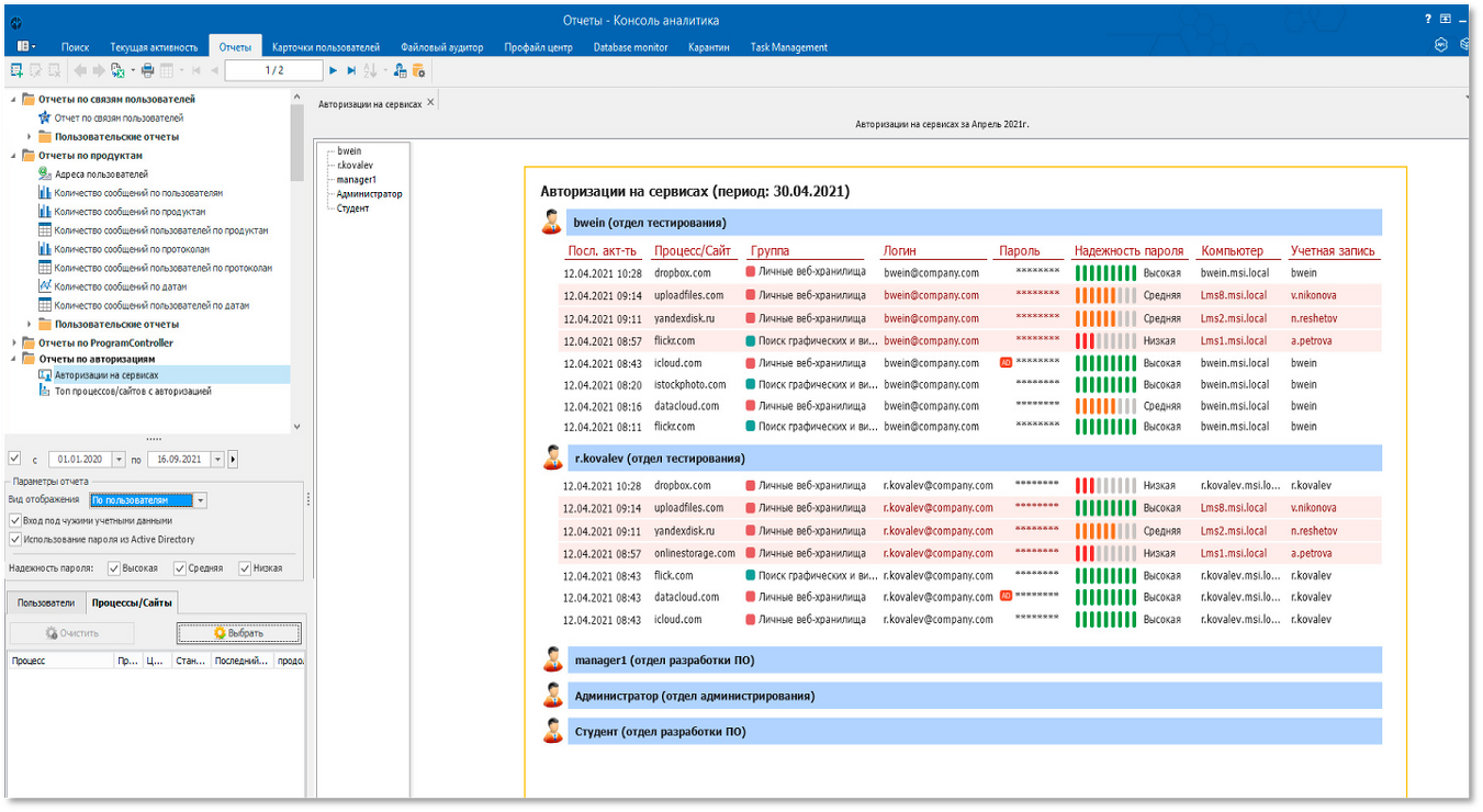 В КИБе есть отчет по авторизациям пользователей, он показывает все сервисы, где сотрудники вводили логин и пароль с корпоративного компьютера. Слабые пароли и те, которые совпадают с корпоративными из Active Directory, в отчете выделены — ИБ-специалист их сразу увидит.
