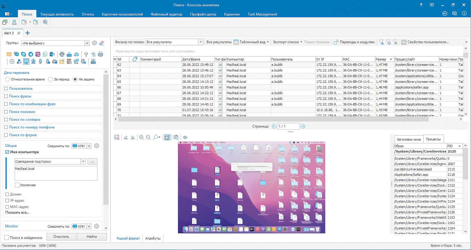 Для «ручных» расследований в КИБ самый широкий на рынке набор инструментов. Можно изучить любое действие, которое совершил пользователь на компьютере, все связанные с ним процессы и сопутствующую активность. Есть возможность проконтролировать сотрудников в режиме реального времени: подключиться к монитору, камере или микрофону.